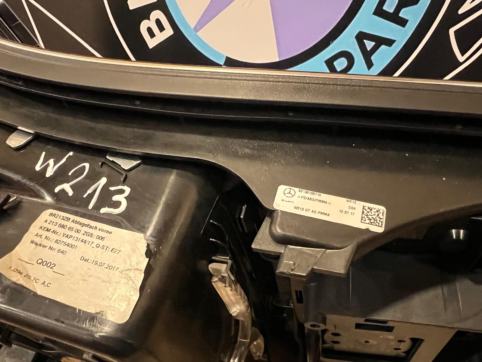 Consola central original da Mercedes-Benz para o modelo E-Class (W213), com referências identificadas na peça A2136806500 e A2138100715. Anos de produção aproximadamente de 2016 a 2023.